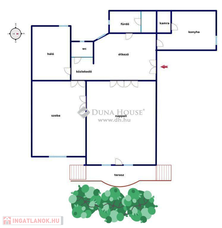 A tágas, napfényes, teraszra nyíló nappali, tökéletes helyszíne a családi beszélgetéseknek, baráti összejöveteleknek. Hangulatát a működő, fatüzelésű cserépkályha növeli. A szobák külön bejáratúak, a belső, zöld udvarra néző nappali és az egyik szoba egybe is nyitható. A konyhában modern bútor és konyhagépek teszik élménnyé az itt töltött időt. Az igényesen kialakított fürdőszobába kád, zuhanykabin, mosdószekrény kerültek beépítésre. A mellékhelyiség szeparált, kézmosóval ellátott.