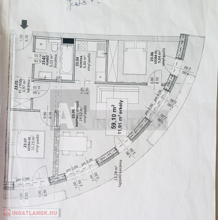 A lakás elrendezését tekintve :59,1 m2 + 11,91 m2-es terasz amely körbeöleli a lakást , az amerikai konyhás nappalival és a két hálószobával is kapcsolódik a kiváló tervezésnek köszönhetően és a tágas előszobából nyíló fürdőszoba .