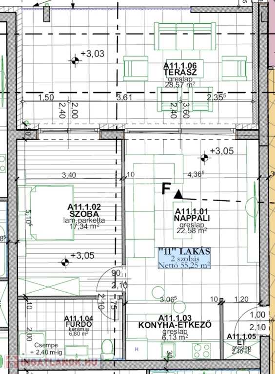 Elrendezés: konyha + étkező – nappali, szoba, előtér, fürdő/wc egy helyiségben, terasz: 28,57nm