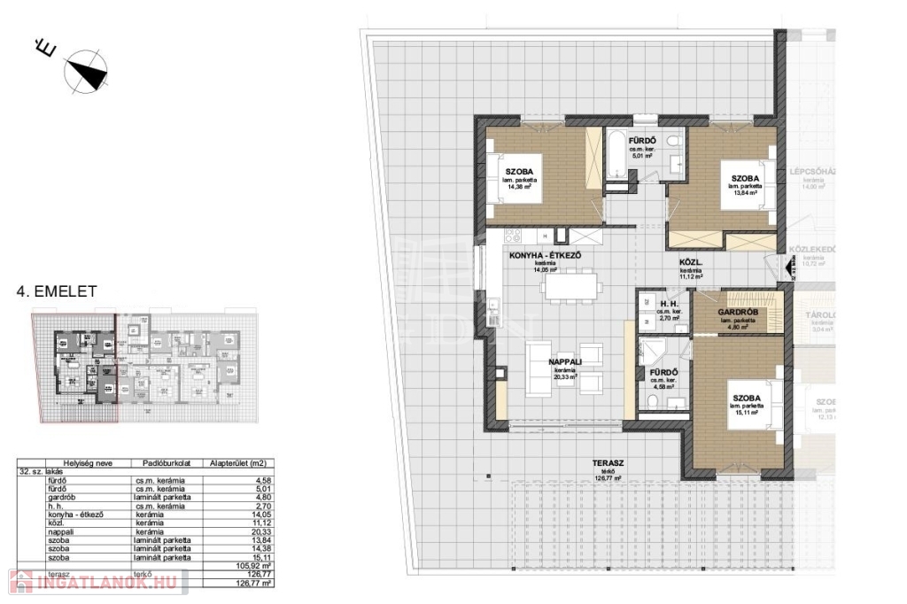 32 lakás: 105,92 m2|konyha + étkező, nappali, 3 hálószoba, közlekedő, 2 db fürdő + wc, háztartási helység, gardrób, terasz: 126,77 m2 Eladási ár: 132.000.000,- Ft