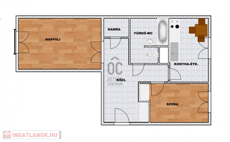 A szobákon kívül, a 45 m2-en a lakás magában foglal egy előszoba-közlekedőt, egy tágas konyha-étkezőt és egy fürdőszobát mellékhelyiséggel.
