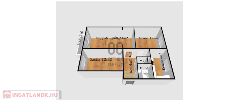 A három szobán kívül, a 68 m2-en a lakás magában foglal egy előszoba-közlekedőt, egy nagy konyha-étkezőt, egy nappalihoz csatlakozó hallt, egy fürdőszobát, egy mellékhelyiséget és egy napos erkélyt.