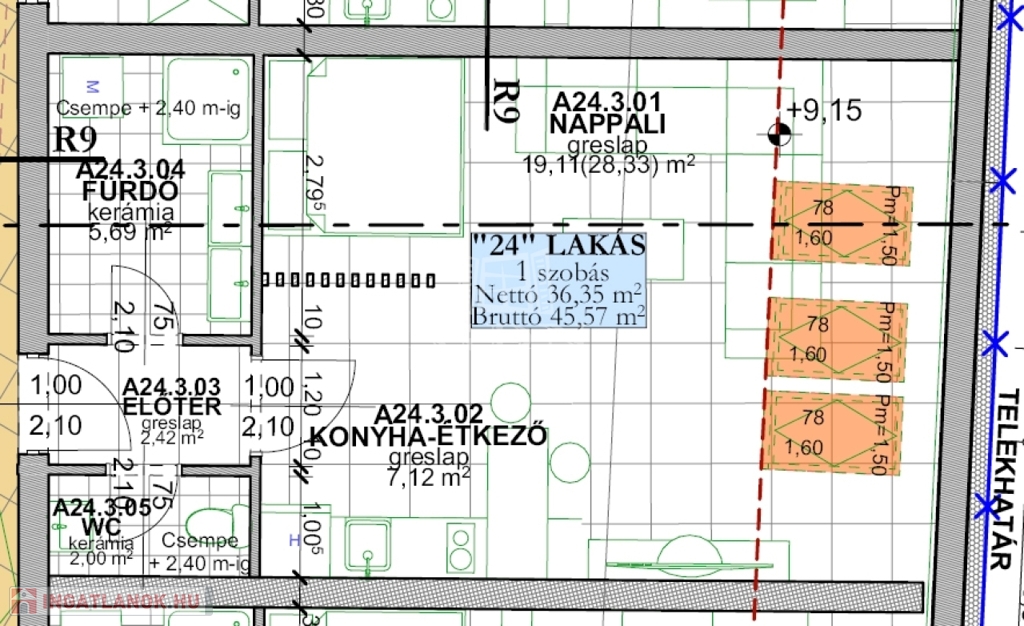 Elrendezés: konyha + étkező – nappali, fürdő/wc külön helyiségben
