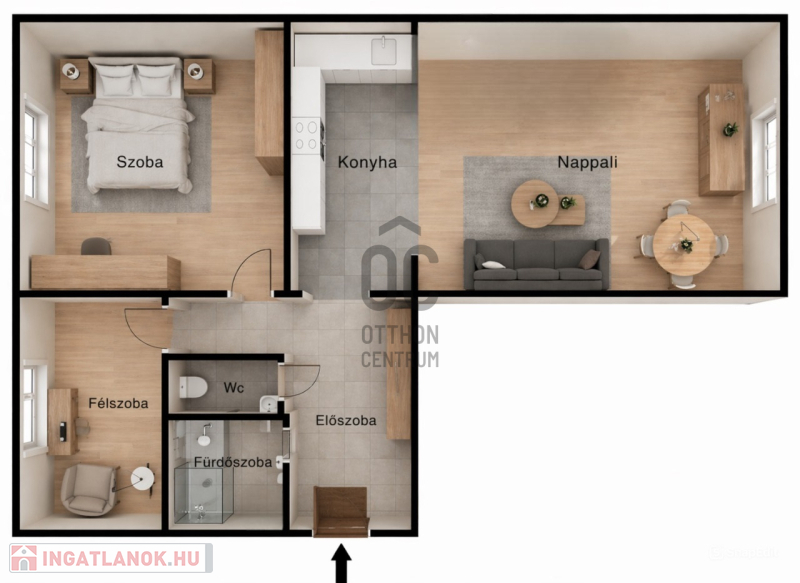Székesfehérváron, a Belvárosban található ez a praktikusan átalakított lakás, amely eredetileg a klasszikus 2 szoba hallos volt. A tulajdonos a konyhát a hall részbe költöztette, így a nappalival egy légtérbe került. A konyha helyén egy félszoba lett kialakítva.