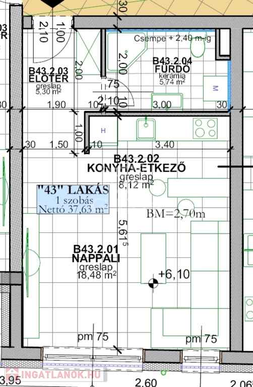 Elrendezés: konyha + étkező - nappali, előtér, fürdő/wc egy helyiségben