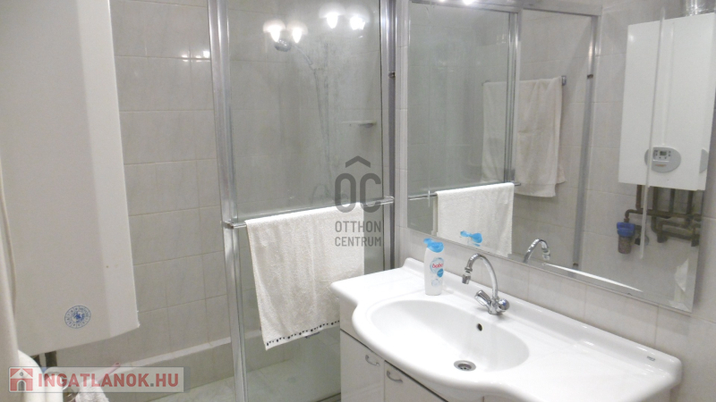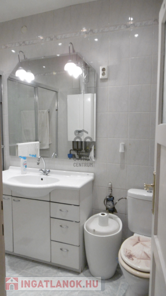 Ehhez az egy légtérhez a legközelebb a közlekedőből megközelíthetően nyílik a külön mosdó – a vendégmosdó – aztán a 3 szoba és a közlekedő másik végén található az intim elhelyezkedésű fürdőszoba-WC, melyben került elhelyezésre egy épített zuhanykabin, és a cirkókazán.