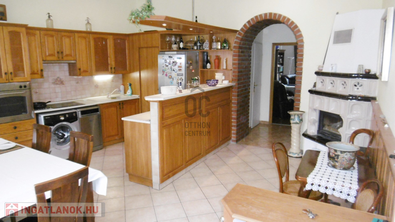 Ebben a tágas, világos egy légtérben kapott helyet egy ízléses beépített kandalló. Ebből az akár nappaliként működő részből egy közlekedő indul.