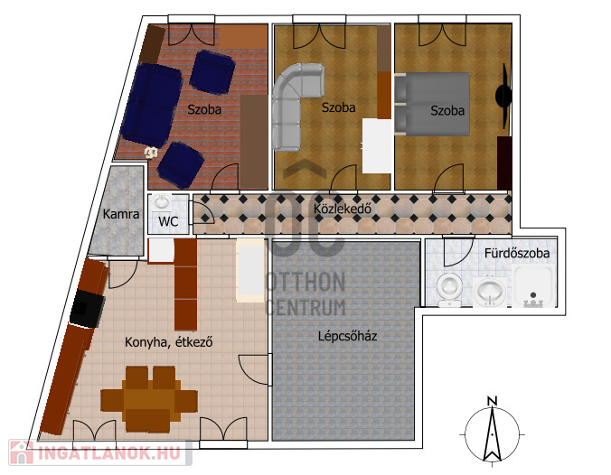 A lakásba egy kényelmesen járható lépcsőházból léphetünk, a tágas, egy légtérben található előszoba-étkező konyhába, melynek konyha részéből egy praktikus jó méretű kamra nyílik.