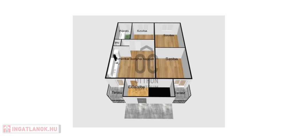 A három szobán kívül, a 100m2-en a lakás magában foglal egy hatalmas amerikaikonyha-nappalit, egy tágas előszobát, egy fürdőszobát, egy mellékhelyiséget és kettő erkélyt.