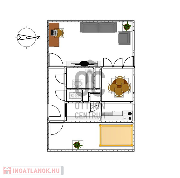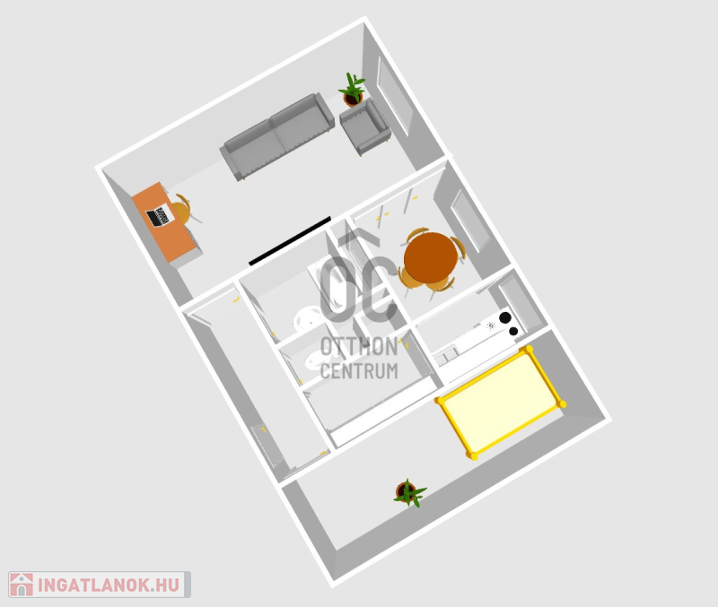 Az ingatlan elrendezése kényelmes és jól használható: tágas, 20 m²-es nappali, 12,85 m²-es hálószoba, mindkét helyiség minőségi parkettával burkolt.
