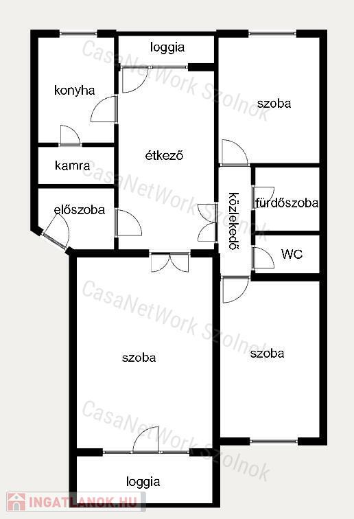 - három egész szoba, konyha, étkező, kamra, előszoba, közlekedő, fürdőszoba és külön WC alkotja