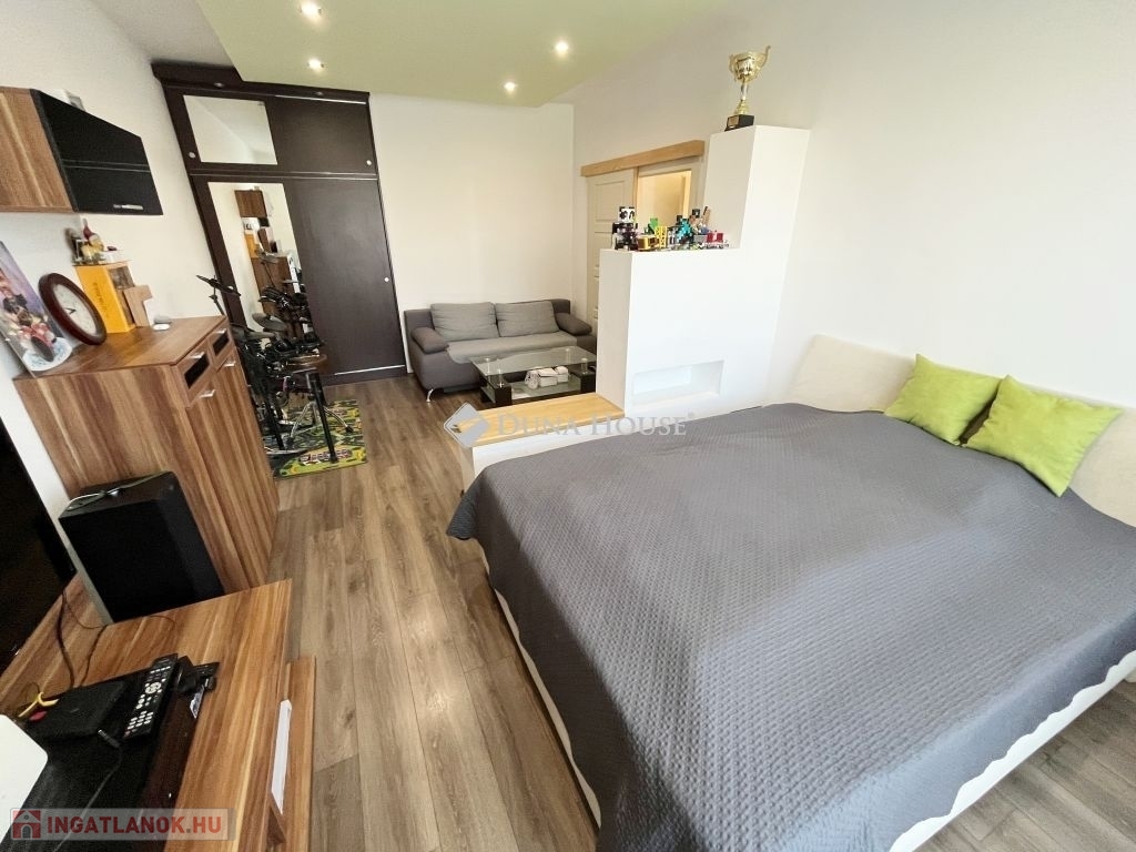 A zöldövezetben található ingatlan egy szigetelt társasház negyedik emeletén található. Az eredetileg másfél szobás lakást, a jelenlegi tulajdonosa átalakíttatta, így jelenleg egy szoba, konyha- étkező, fürdő-wc, kamra helyiségekből áll. (Igény esetén visszaalakítható másfél szobássá)