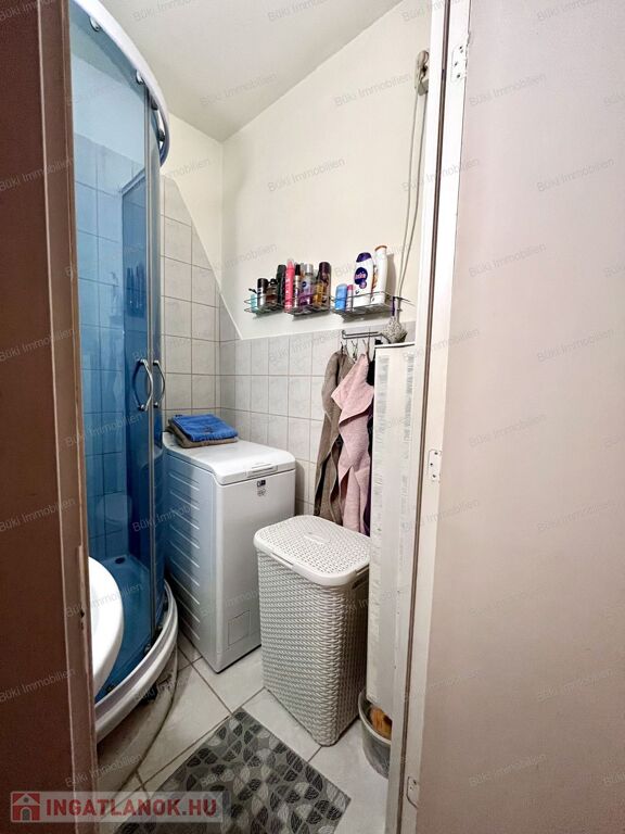 A konyha és étkező közvetlen kapcsolata igazi családi fészekké teszi ezt a sarkot: a világos fa bútorok melegséget sugároznak, a négy székkel körbeült asztal meghitt reggeleket és vidám vacsorákat ígér, ahol a nevetés természetesen visszhangzik, miközben a közeli elhelyezkedés gyors, kényelmes főzést tesz lehetővé – nincs felesleges járkálás, minden kéznél van. A fürdőszoba és külön WC komfortos luxus több lakó esetén: a világos csempés zuhanyzó frissítő, modern, a mosógép praktikusan elhelyezve, a tárolópolcok pedig mindent elnyelnek, így a reggeli rohanás zökkenőmentes, a tisztaság pedig magától értetődő.