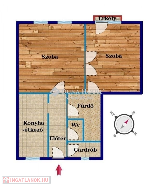 Helyiségei: előszoba, zuhanyzós fürdő, külön wc, konyha-étkező, 2 szoba, egy kis gardróbhelyiség és egy pici francia erkély.