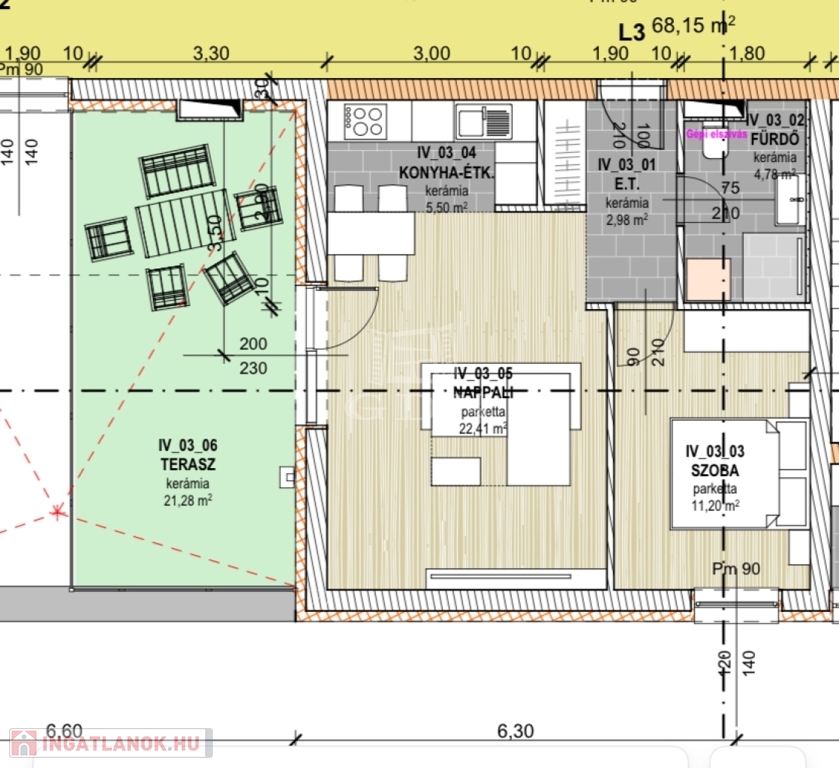 Az ingatlan alapterülete 46.87 m2, 21.42 m2 terasszal.