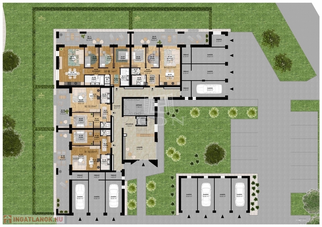 Modern megjelenésű, értékálló, kényelmes és élhető lakóparkban valamint az épületekhez kapcsolódó egyedi lakókörnyezetben szeretne élni? Hamarosan megvalósulhat az álma. A Gyöngyös-patak partján belváros közeli prémium lakások épülnek 20 000 m2-es területen, több ütemben. A tervezés során a funkció, a környezettudatosság és a kényelem voltak a legfontosabb tervezési szempontok. Így különösen az épületek szellős elhelyezése, a lakások kedvező tájolása, az épületek körül a maximális zöldterület és a megfelelő garázs szám biztosítása, a színvonalas közösségi funkciók kialakítása. A lakások értékállóságát és kényelmét az átgondolt tervezés, a minőségi anyagok használata, a nagy méretű, intim teraszok, a lift, a megújuló energia, egyedi és közös tárolók, fedett beállók, garázsok biztosítják. Az alkalmazott szerkezetek megfelelnek a ma érvényes “közel nulla energiaigényű épületek” követelményeinek. Az épületek előtti sétányok díszkivilágítást kapnak mozgás- és alkonykapcsolás vezérlésével. A sétányokról különböző típusú gépkocsi beállóhelyek – felszíni fedett, és normál parkolók ill. garázsok - közelíthetők meg. Egyes parkolók között beruházói döntés szerinti helyen és műszaki kialakítással, elektromos töltőpont csatlakozási lehetőség biztosítható. A közös területek alkalmasak játékra, pihenésre, a földszinti lakások előtti kijelölt zöldterület saját használata mellett. A ház kaputelefon rendszerrel lesz felszerelve. A lépcsőházban és egyéb közös terekben légterenként időkapcsolós világítás lesz kiépítve. A mai korszerű követelményeknek, az épületek hő és hangszigetelése a vonatkozó szabályoknak maximálisan megfelel. A külső hőszigetelés vastagsága 16-20 cm. Az ablakok 3 rétegű üvegezéssel kiváló hőszigetelésű nyílászárók. A lakások padlófűtéssel rendelkeznek, mely a szabadabb belsőépítészeti kialakításoknak ad lehetőséget. A tervek szerint a központi gépészet távfelügyeleti rendszerrel ellátott, távfűtés, így a karbantartás és üzemeltetés során ez gyors beavatkozást és üzembiztonságot eredményez. A fogyasztás egyedi mérőkkel mért, az elszámolást a közös képviselő végzi. A megújuló energia tervek szerint a megfelelő energetikai szabályok alapján kerül telepítésre pl. napelemrendszer. (Kiviteli terv során változhat: kondenzációs gázkazán és/vagy hőszivattyú). Belsőépítész által tervezett lakások, nagy teraszokkal kapcsolódnak a természethez. Befektetőknek, nagy családoknak alkalmas lakások kerülnek kialakításra. A kisebb lakások 52 m2, 62 m2, a nagyobb lakások 67 m2, 76 m2 és 89 m2 nagyságúak lesznek. 12-33 m2 fedett intim teraszok kerülnek kialakításra. Aktuális, bevezető ajánlatban az 1db felszíni parkolót, vízlágyító rendszert, klíma előkészítést ajándékba adja a beruházó. A lakásokhoz tárolók, garázsok vásárolhatók. Kimerítőbb tájékoztatást személyesen. A hírdetésben szereplő lakás földszint 1.