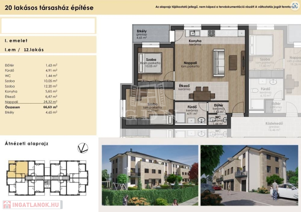 A három szintes kettő emeletes, 20 lakásos modern társasházak minden igényt kielégítő, magas műszaki tartalommal valósulnak meg. A kiváló tájolású 40-67 m2 közötti ingatlanokat nagyon jó elosztás és élhető terek jellemzik. A lakások nappali+egy , nappali +kettő szobásak lesznek. A földszinti lakások komfortérzetét teraszok, saját kertek az emeleti lakásokét jó méretű erkélyek fokozzák. Nyílászárói 3 rétegű fokozottan hő- és hangszigetelt üvegezésű műanyag ablakok és erkélyajtók, redőny fogadására alkalmas szemöldök kialakítással. A lakások bejárati ajtaja MABISZ minősítéssel rendelkező tömör, több ponton záródó biztonsági ajtó. Fűtése központi gázfűtés tervezett, kondenzációs gázkazánnal a lakásokban egyedi hőmennyiség szabályozással és mérővel, padlófűtéses hőleadással. Klímaelőkészítést a vételár magában foglalja. Hideg -meleg burkolatok ,szaniterek, csaptelepek, beltéri ajtók választhatók. Az ingatlanhoz felszíni parkoló, garázs vásárolható.