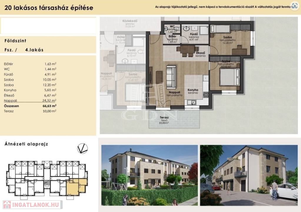 A három szintes kettő emeletes, 20 lakásos modern társasházak minden igényt kielégítő, magas műszaki tartalommal valósulnak meg. A kiváló tájolású 40-67 m2 közötti ingatlanokat nagyon jó elosztás és élhető terek jellemzik. A lakások nappali+egy , nappali +kettő szobásak lesznek. A földszinti lakások komfortérzetét teraszok, saját kertek az emeleti lakásokét jó méretű erkélyek fokozzák. Nyílászárói 3 rétegű fokozottan hő- és hangszigetelt üvegezésű műanyag ablakok és erkélyajtók, redőny fogadására alkalmas szemöldök kialakítással. A lakások bejárati ajtaja MABISZ minősítéssel rendelkező tömör, több ponton záródó biztonsági ajtó. Fűtése központi gázfűtés tervezett, kondenzációs gázkazánnal a lakásokban egyedi hőmennyiség szabályozással és mérővel, padlófűtéses hőleadással. Klímaelőkészítést a vételár magában foglalja. Hideg -meleg burkolatok ,szaniterek, csaptelepek, beltéri ajtók választhatók. Az ingatlanhoz felszíni parkoló, garázs vásárolható.