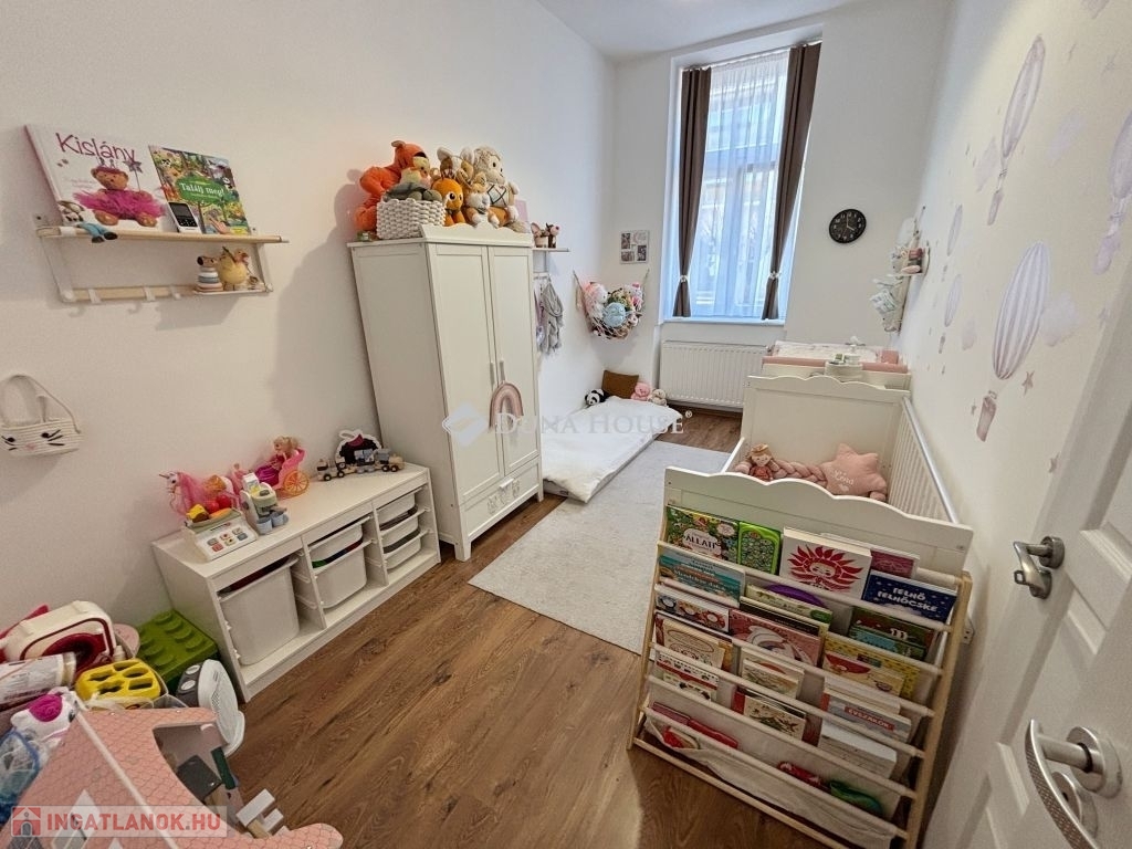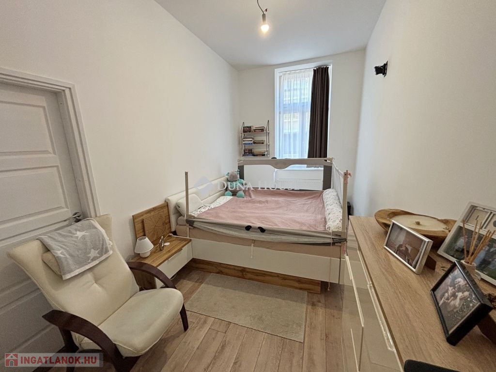 A lakásba a kapuszínből jutunk be, előszobájából nyílik a három utcafronti szoba, a fürdő-wc, a ház belső udvarára tájolt a konyha és a galériázott nappali, a galériából nyílik egy kisebb, zuhanyzós fürdő-wc. (összesen 80 m2 + a galériaszint). Az ingatlan 2010 és 2015 között teljes felújításon esett át, műszakilag is korszerűsítve lett, esztétikailag is hibátlan állapotban van. Fűtését gáz-cirkó kazán biztosítja, alternatívaként hűtő-fűtő klímaberendezést is felszereltek.