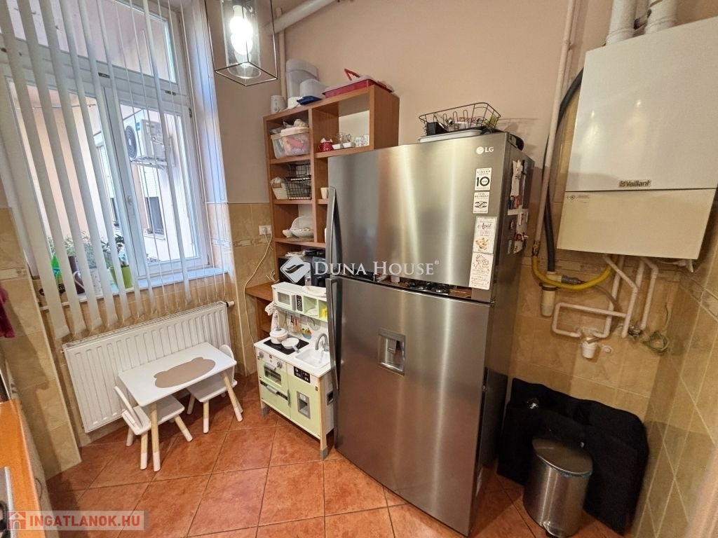 A lakásba a kapuszínből jutunk be, előszobájából nyílik a három utcafronti szoba, a fürdő-wc, a ház belső udvarára tájolt a konyha és a galériázott nappali, a galériából nyílik egy kisebb, zuhanyzós fürdő-wc. (összesen 80 m2 + a galériaszint). Az ingatlan 2010 és 2015 között teljes felújításon esett át, műszakilag is korszerűsítve lett, esztétikailag is hibátlan állapotban van. Fűtését gáz-cirkó kazán biztosítja, alternatívaként hűtő-fűtő klímaberendezést is felszereltek.
