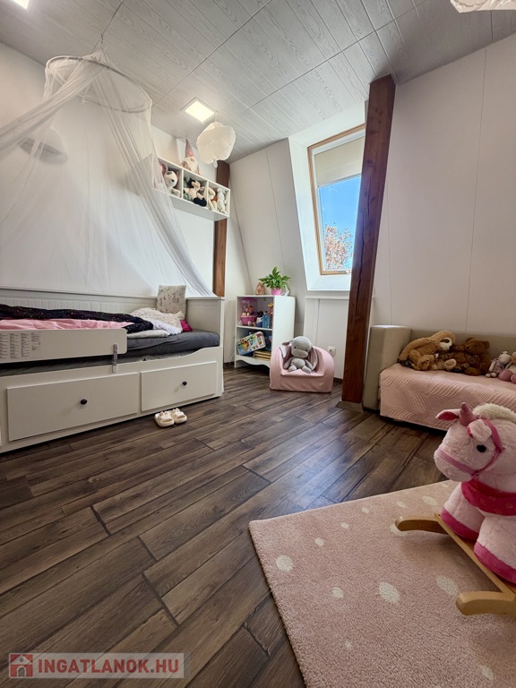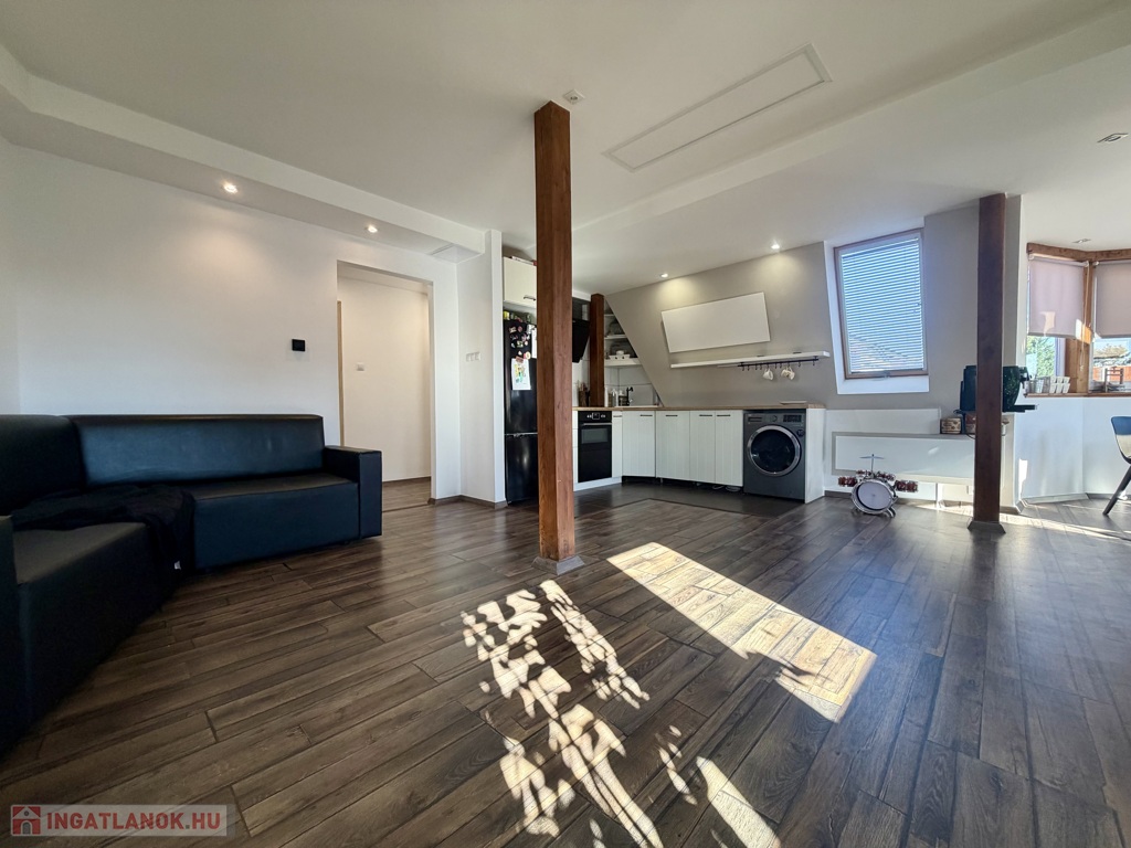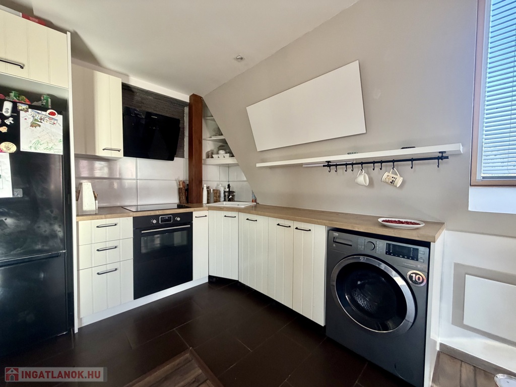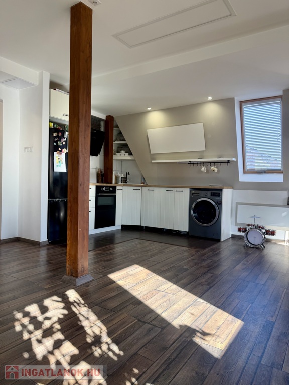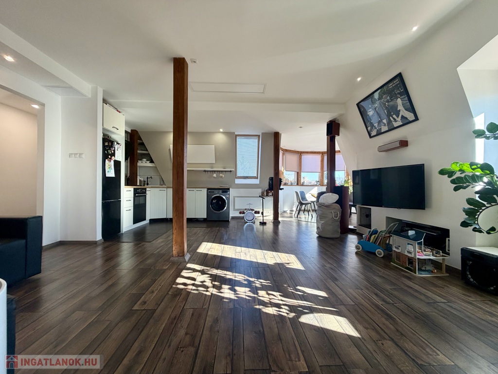 A hálószobából egy kis erkély is nyílik, a nappali-étkező rész pedig a lakás igazi különlegessége – egy toronyszerű, körbenapozott toronyszerű étkezőrész, amely egyedi karaktert és meleg, barátságos hangulatot ad az egész otthonnak.