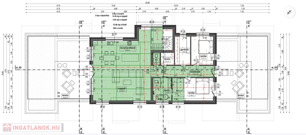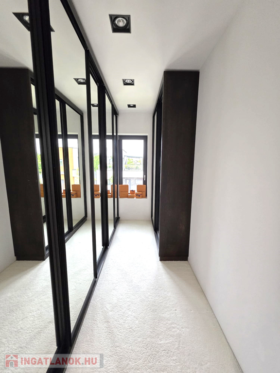 -2 hálószoba, 1 gardróbszoba, mosókonyha, tároló, külön fürdőszoba és mellékhelyiség, nappali, konyha, étkező egy légtérben.