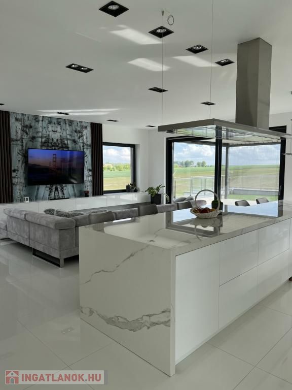 -Konyha + étkező egy légtérben található a nappalival. A nappaliból nyílik a 75m2-es terasz, melyet 120x120-as Atlas Concorde 2cm vastag kőporcelán és műfű borít és Alumínium Pergola fedi.