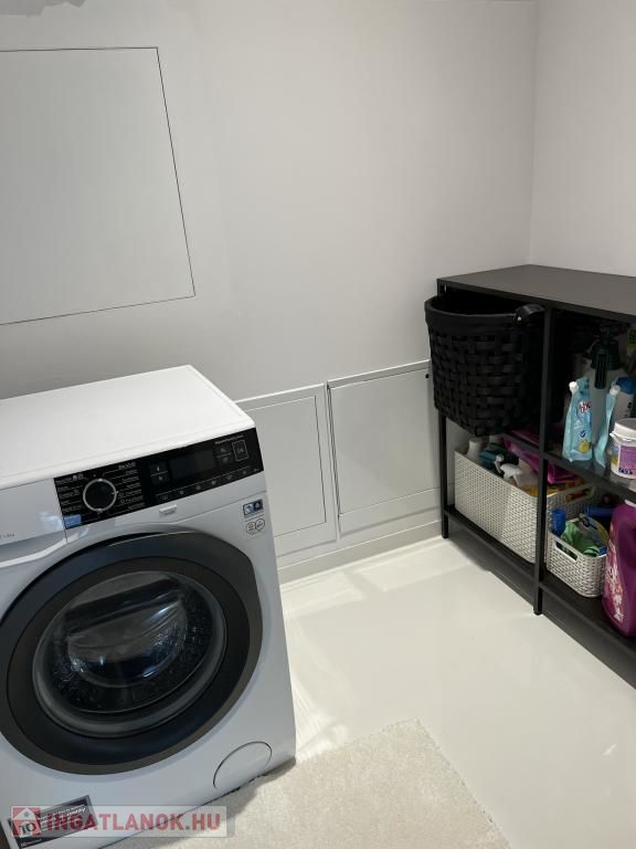 Lépcső alatt elhelyezkedő tárolóban található a hőszivattyú és BWT vízlágyító rendszer melyek mellett bicikli, babakocsi és egyéb kisebb dolgok elférnek.