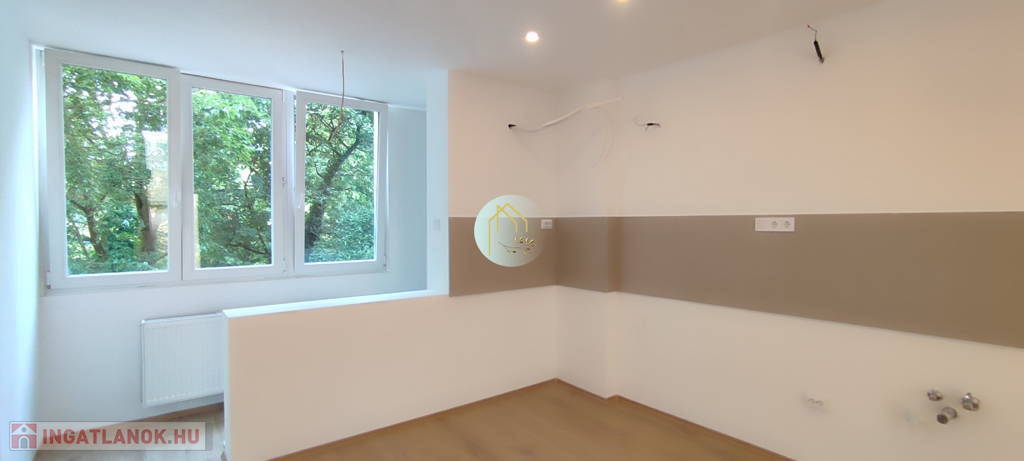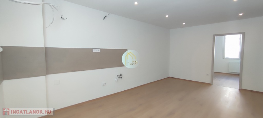 Konyhabútor helye kialakítva, víz kiállások, külön mosogatógépnek is, szennyvízelvezetés, gipszkartonos mennyezet led világítással felszerelt.