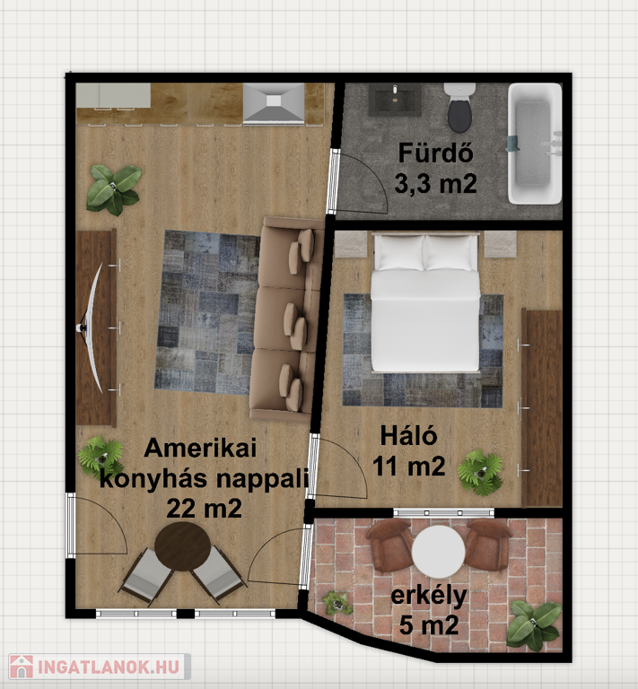 - Nappali-konyha laminált padlóval, hálószoba padlószőnyeggel burkolt