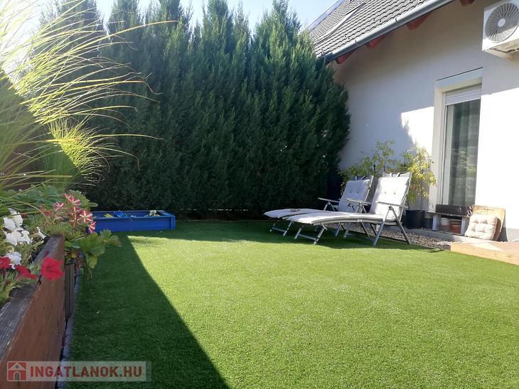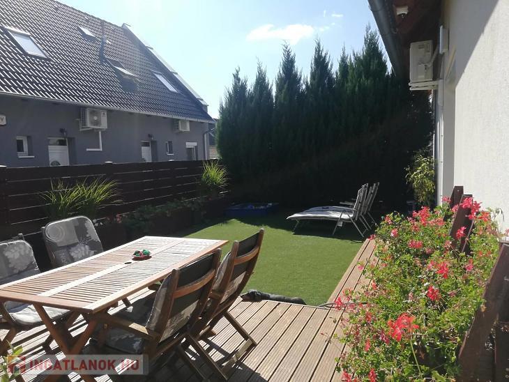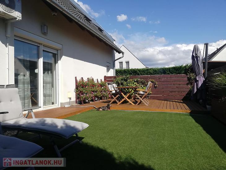 Az ingatlan remek elosztású: az alsó szinten egy tágas előszoba fogad, innen nyílik az amerikai konyhás nappali, két praktikus kamra, valamint egy vendég WC. A nappaliból közvetlen kijárat vezet a 70 nm-es, privát, elkerített kertbe, ahol egy gondosan kialakított, terasz biztosít ideális helyszínt pihenéshez vagy baráti összejövetelekhez.
