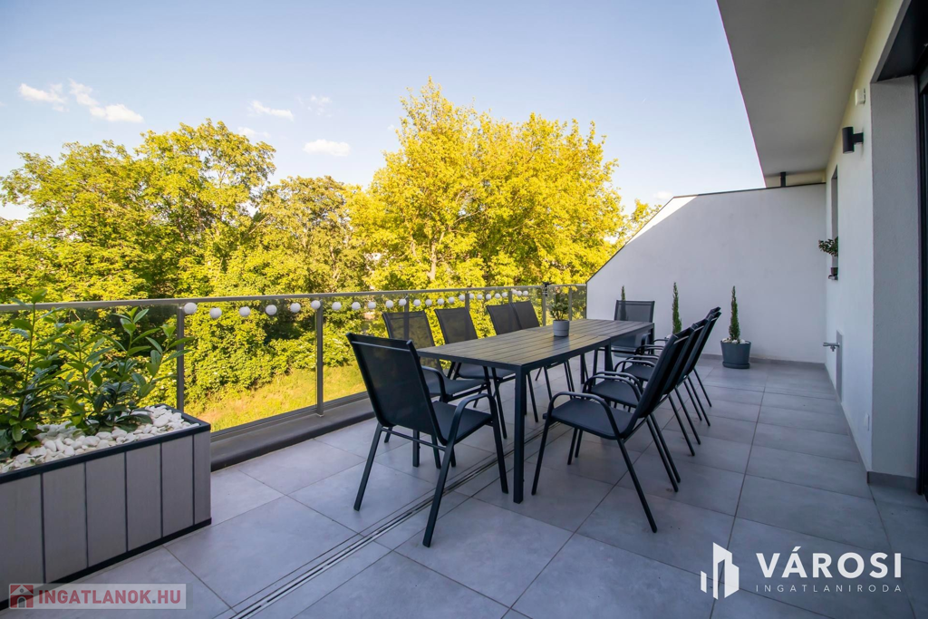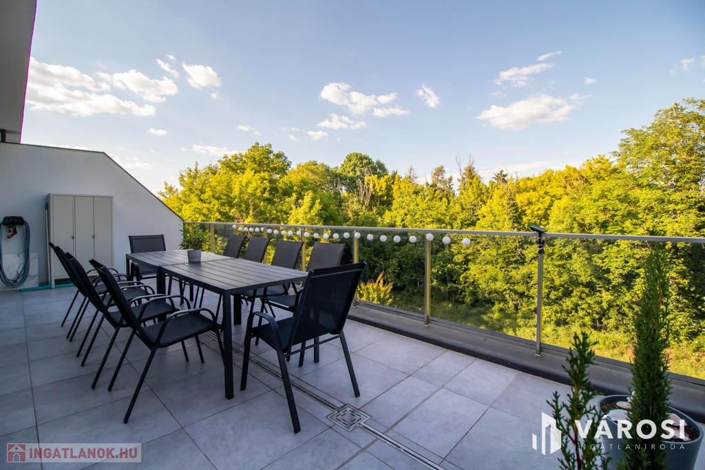 A lakás kiemelkedő része a két hatalmas terasz. Az egyikről a napfelkeltét csodálhatjuk meg, akár reggelizés közben, miközben a ház melletti erdő fáin lakó madarak csicsergését hallgatjuk. A másik erkélyről a naplemente csodás fényeiben gyönyörködhetünk. A nyári nagy melegben mindig van egy olyan terasz, ahol árnyékban, vagy a napon lehetünk. Az egyik terasz statikailag alkalmas jacuzzi elhelyezésére is. A vízkiállás már ki van építve hozzá.