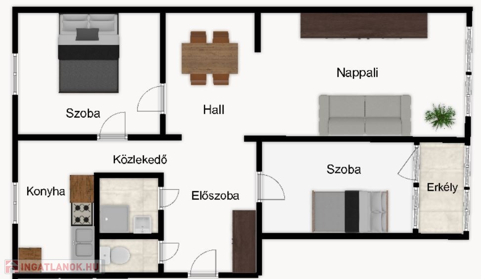 tágas nappali, két külön nyíló hálószoba, hall, konyha, közlekedő, valamint külön fürdőszoba és WC szolgálja a kényelmes mindennapokat. Az egyik szobából nyíló erkély (loggia) kellemes kis tér, ahol jól esik a reggeli kávé elfogyasztása vagy egy fárasztó nap utáni beszélgetés.