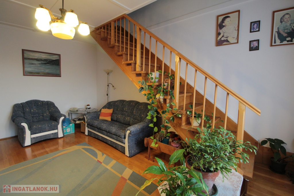 Alsó szinten egy nappali, konyha, étkező, WC, fürdő és 2 félszoba