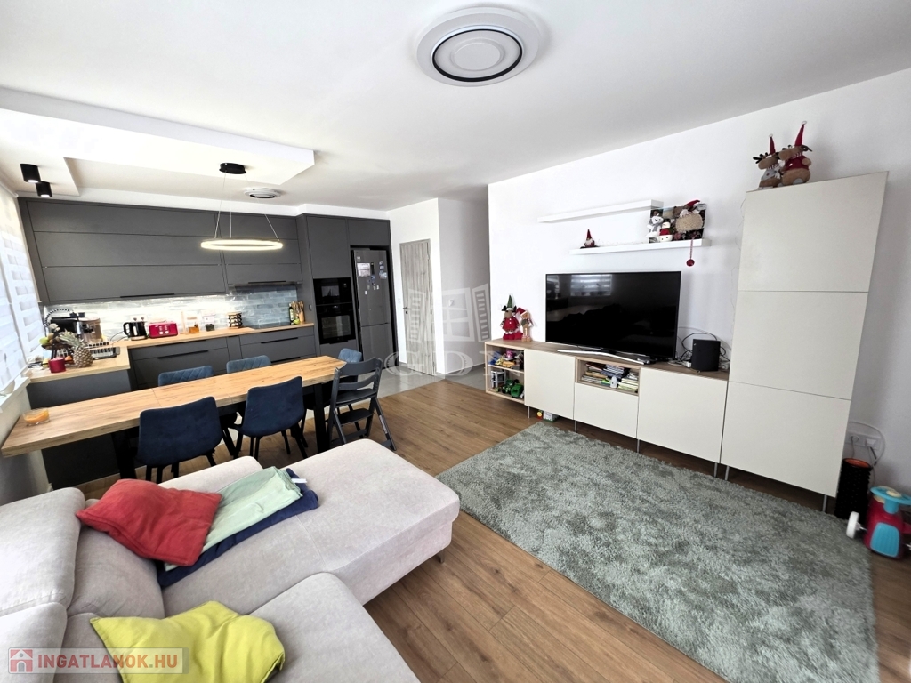 - A tágas nappali–amerikai konyhás tér a lakás valódi központja, amely gépesített konyhával várja új tulajdonosát – tökéletes helyszín a mindennapokra és a vendéglátásra egyaránt.