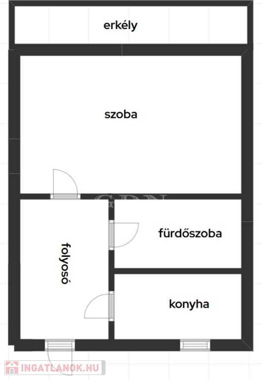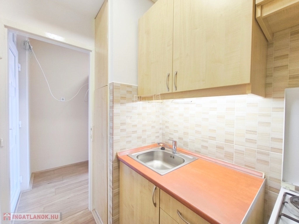 A lakás praktikus elrendezésű: a tágas, világos szoba erkélykapcsolattal bír, mely mellett külön konyha, valamint egy fürdőszoba került kialakításra.