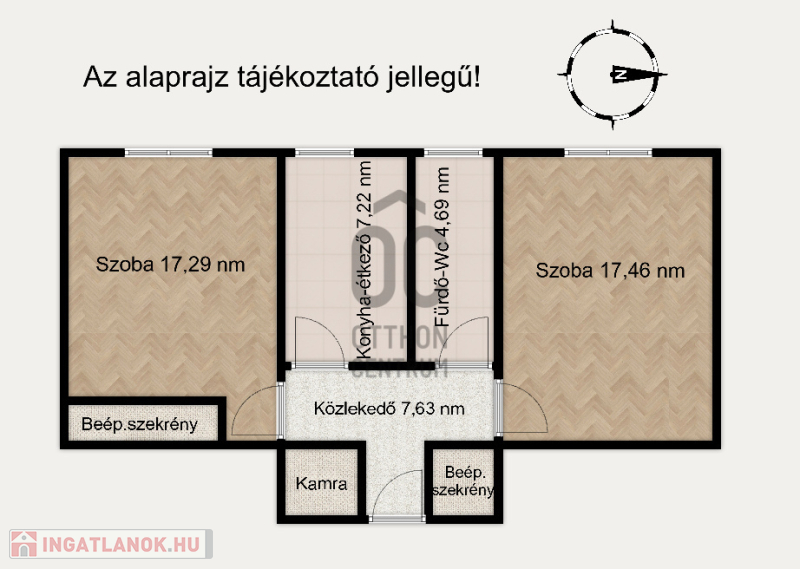 Az ingatlanban 2 különnyíló szoba, konyha-étkező, fürdőszoba- Wc, közlekedő helyiségek találhatóak, illetve több beépített szekrény biztosítja az optimális helykihasználást és tartozik egy önálló és egy közös használatú tároló is a lakáshoz.