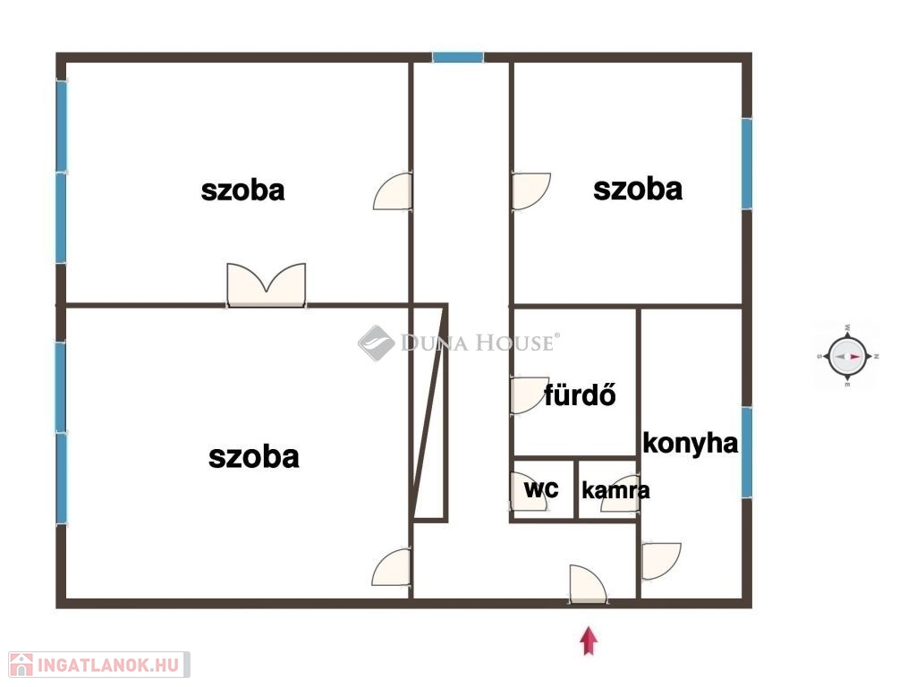 Az ingatlanba belépve egy beépített szekrényes folyosót találunk. Innen nyílik 3 kényelmes méretű szoba, valamint egy fürdő és egy wc.