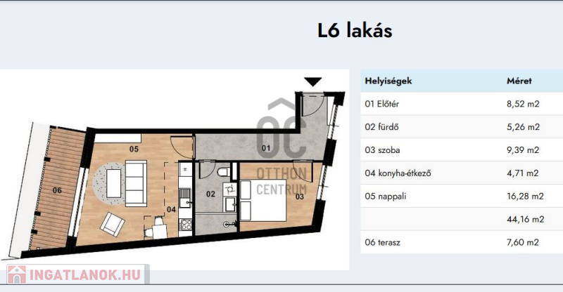 - 44,16 négyzetméter, alacsony energiaigényű, 7,6négyzetméteres terasszal