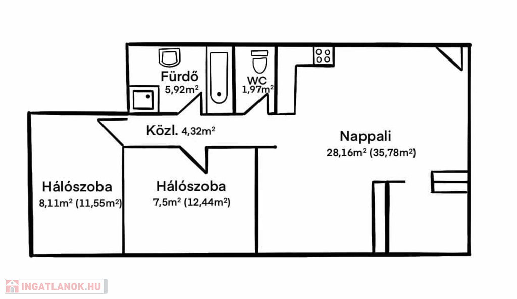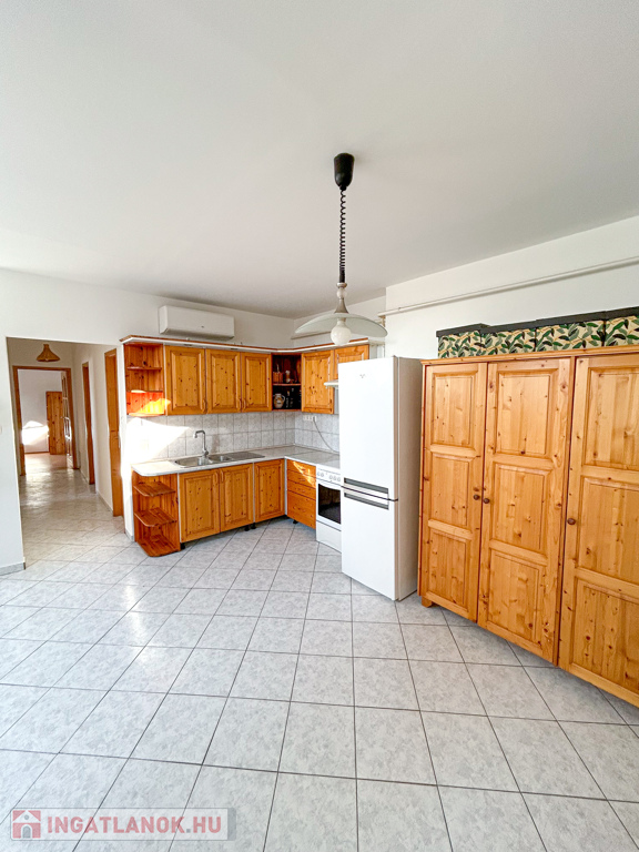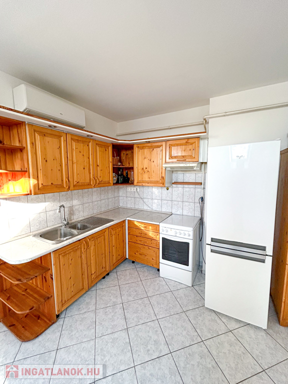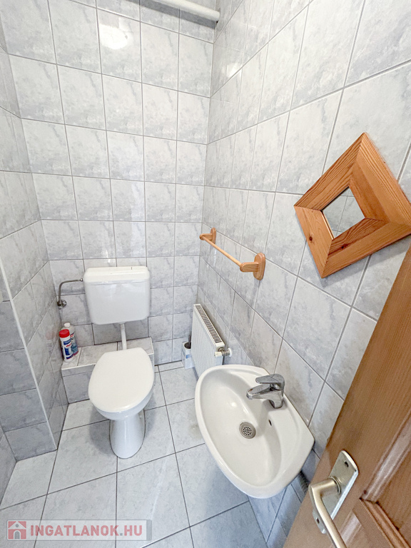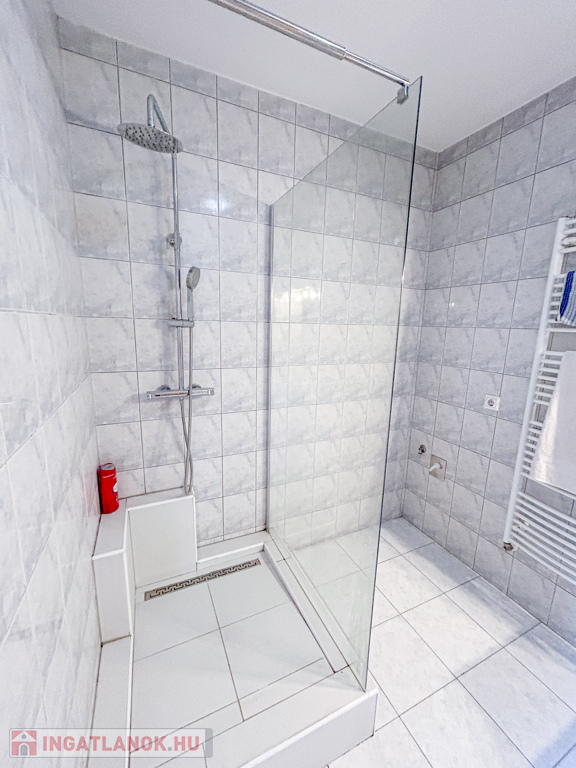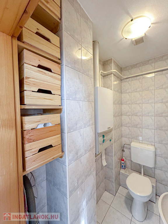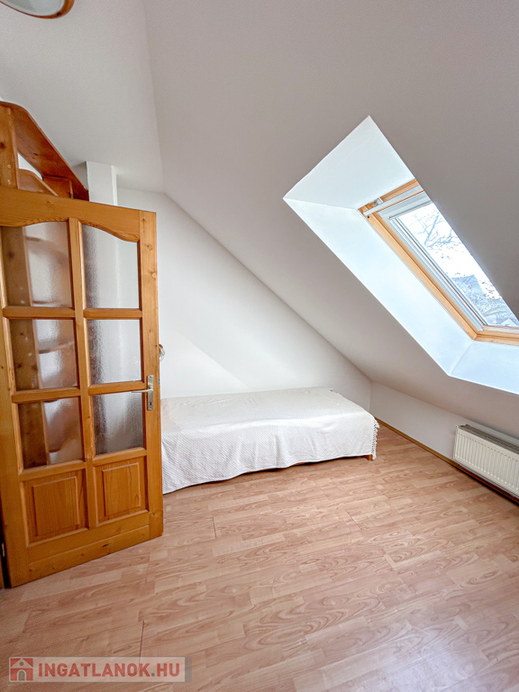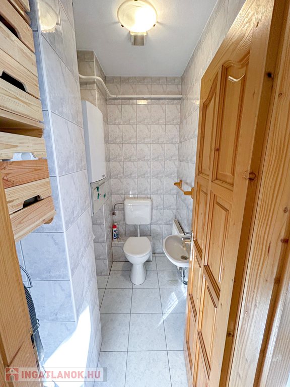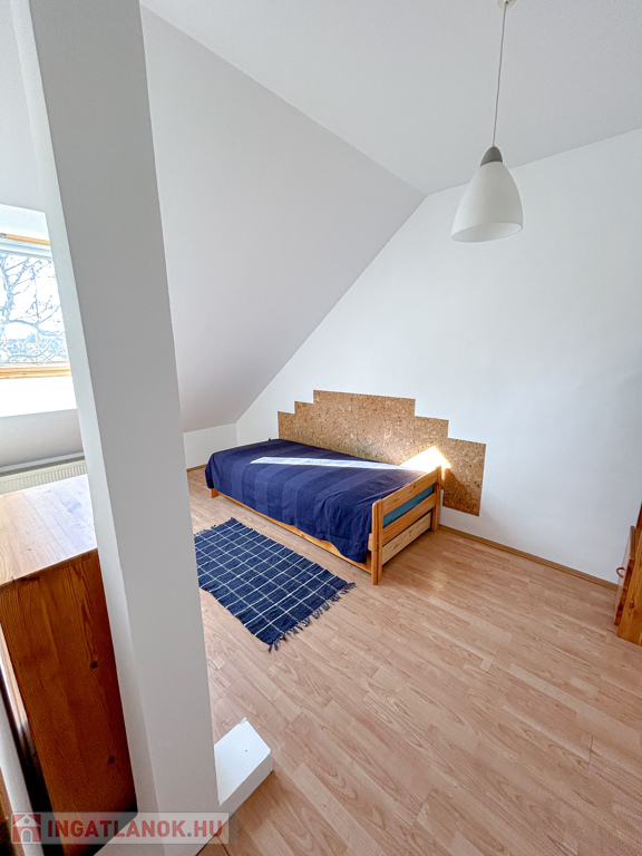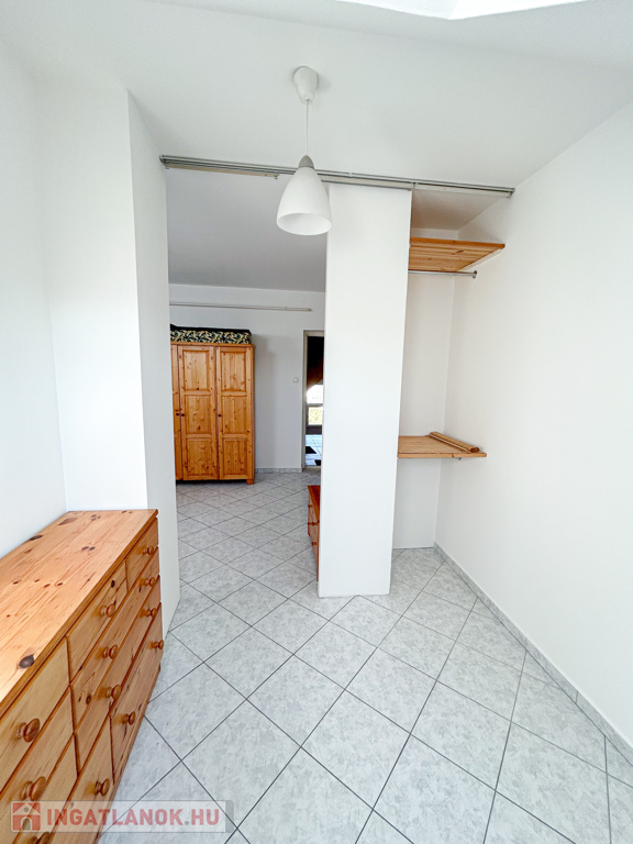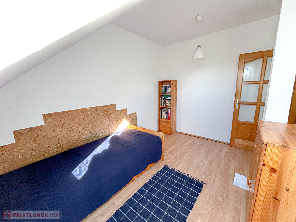 A nappali-konyha részből egy kis közlekedőn keresztül közelíthető meg két nagyméretű, jól berendezhető hálószoba, továbbá a fürdőszoba, amely káddal és egyedi épített, üvegfalas zuhanyzóval is felszerelt. A különálló toalettben kapott helyet a gázcirkó kazán, valamint további praktikus tárolóhely is rendelkezésre áll.