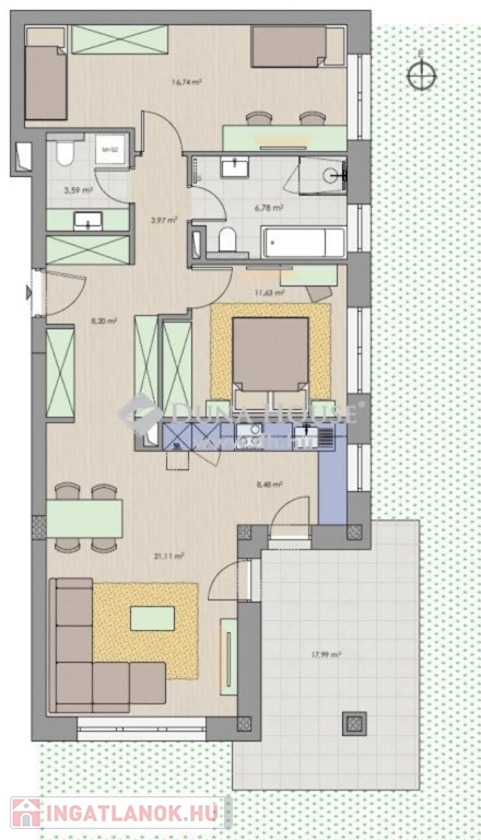 Az épületek egymástól kényelmes távolságra helyezkednek el, a beépítés szellős, nem túlépített. Az alacsony beépítési mutató mellett a telek nagy része zöldfelület, fákkal, növényekkel betelepített, a lenti épületek között közösségi udvar, park kerül kialakítása. A parkolók térvilágítást, az épületek közötti sétányok díszkivilágítást kapnak mozgás- és alkonykapcsolós vezérléssel.