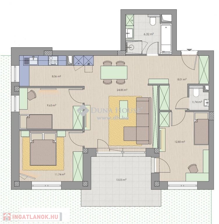 magas műszaki felszereltségre (hőszivattyús fűtés, klíma, modern nyílászárók, redőnyelőkészítés, igényes burkolatok)