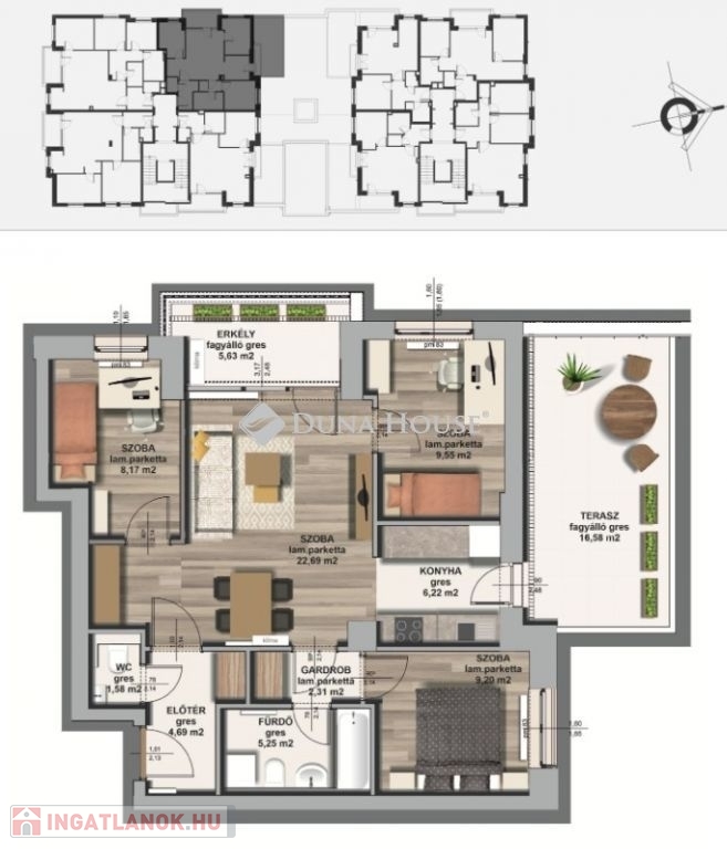 A négy lépcsőházból álló társasházában, két épülettömbben 30 db lakás kerül megépítésre, alagsori teremgarázs, magasföldszint, 3 emeletes kialakításban. Az igényes, lifttel ellátott lépcsőházakban emeletenként 4 db kettő égtájolású változatos méretű lakás, a „C” jelzésű épület negyedik emeletén pedig 2 db három égtájolású nagyobb alapterületű penthouse lakás létesül.