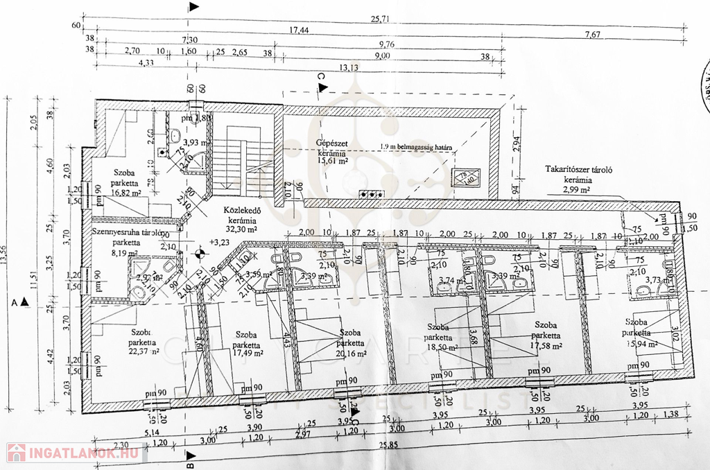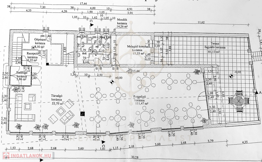 Az első szinten található még egy 15 fős külön tárgyalóterem, valamint a gépház, amelyben a központi légkondicionáló berendezés és a 2 db Buderus gázkazán került elhelyezésre.