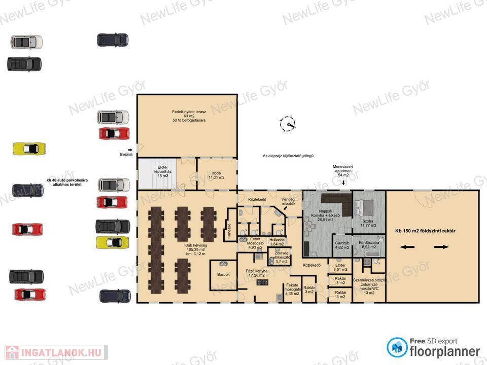 213 m2: étterem (13m*11m) konyha (50 fő kiszolgálására alkalmas), raktárak,