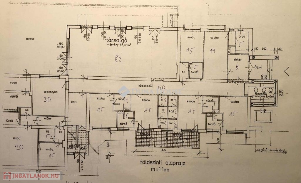 Földszint: tágas társalgó–étterem, felszerelt konyha, 8 fürdőszobás szoba, valamint kiszolgáló helyiségek.