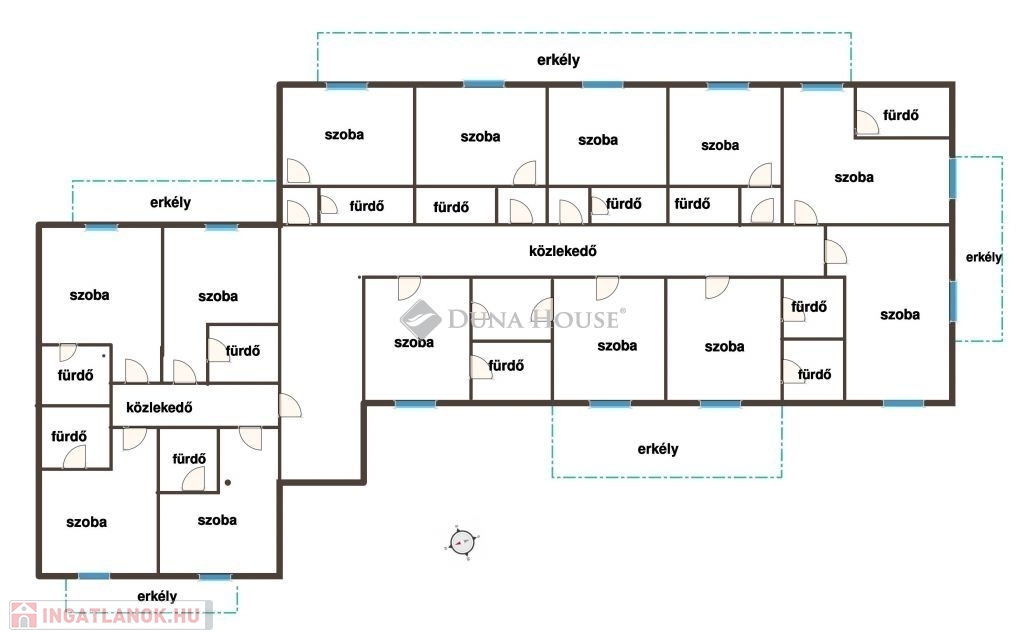 Első emelet: 13 kényelmes, saját fürdőszobával rendelkező szoba, közlekedő és további kiszolgáló helyiségek.