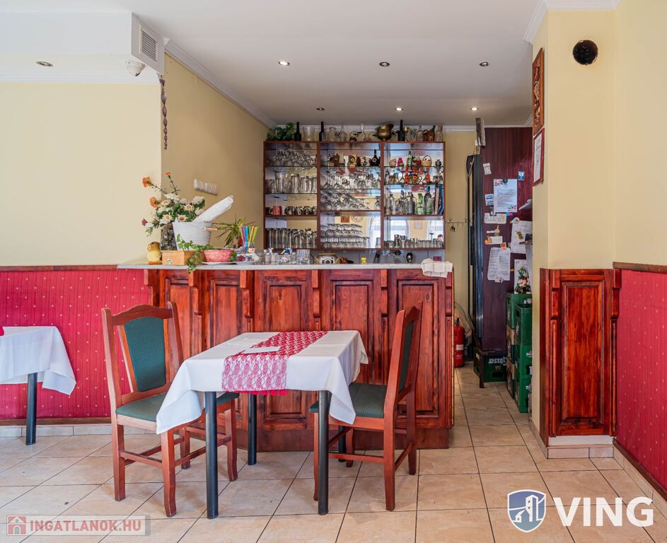 A földszinten egy utcai bejáratos meleg és hidegkonyhás étterem található, amely 42 fő kényelmes befogadására alkalmas, akár kisebb rendezvények lebonyolítására is kiváló helyszínt ad. A szinten található még egy bárrész és a mosdók. A konyhai rész praktikus elosztású. Az étteremből a zárt udvarra jutunk ki, ahol nyaranta kerthelyiség üzemelt.
