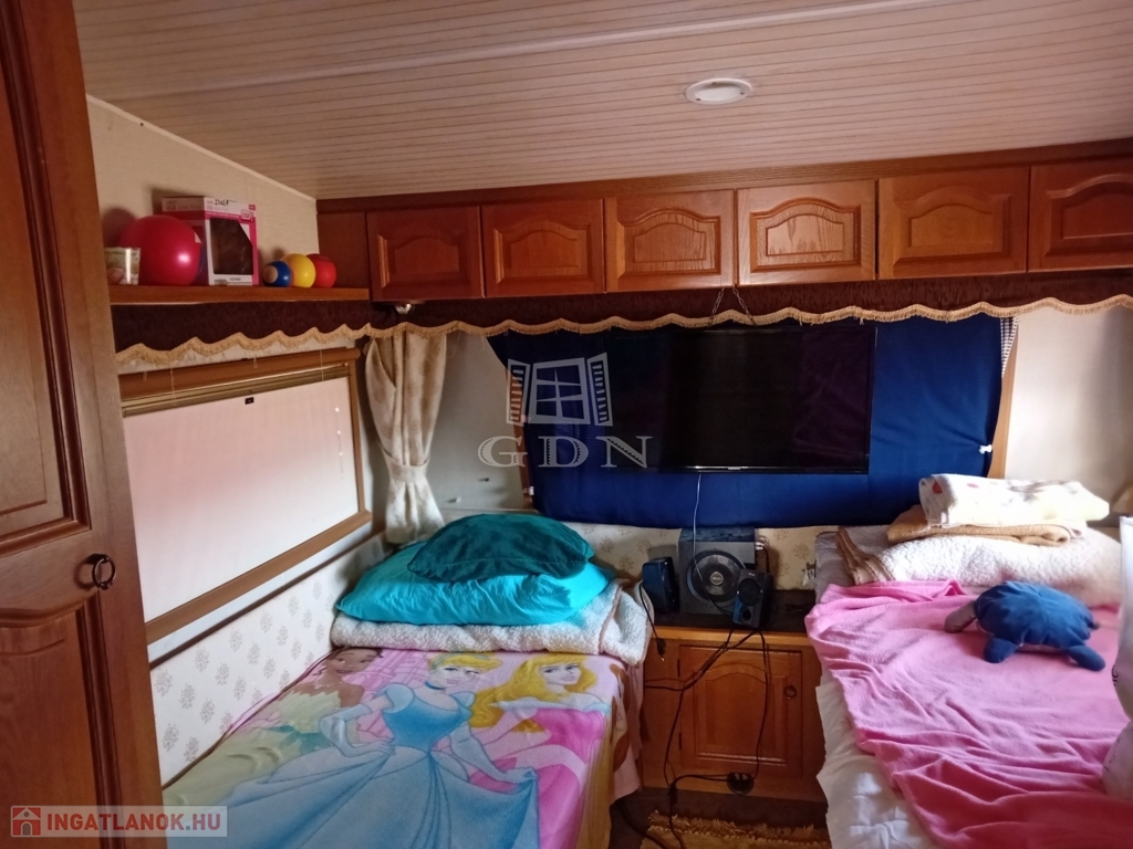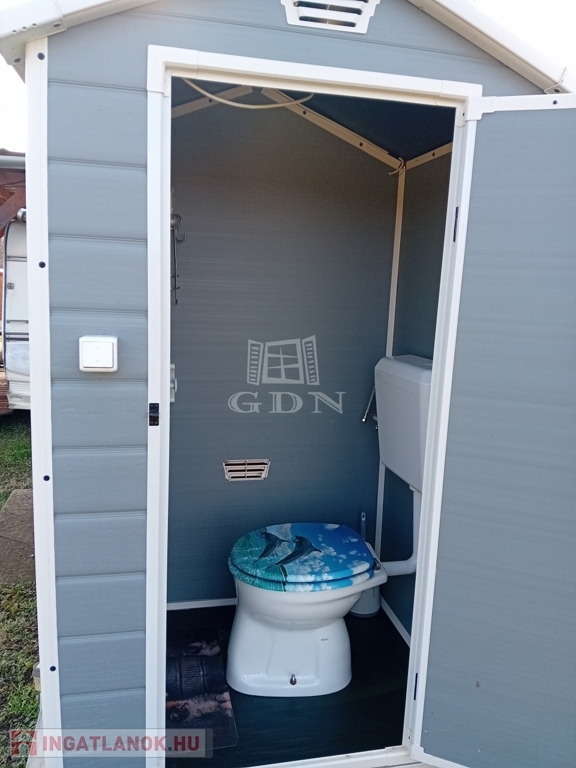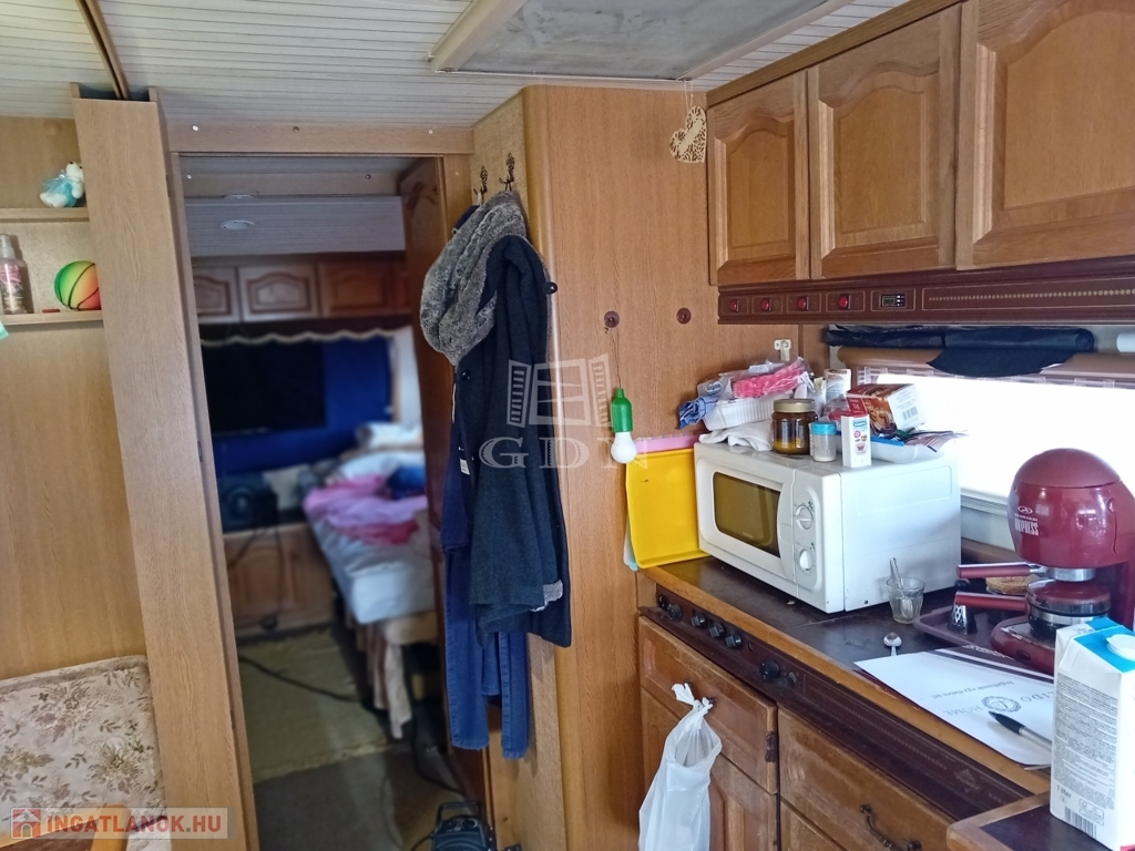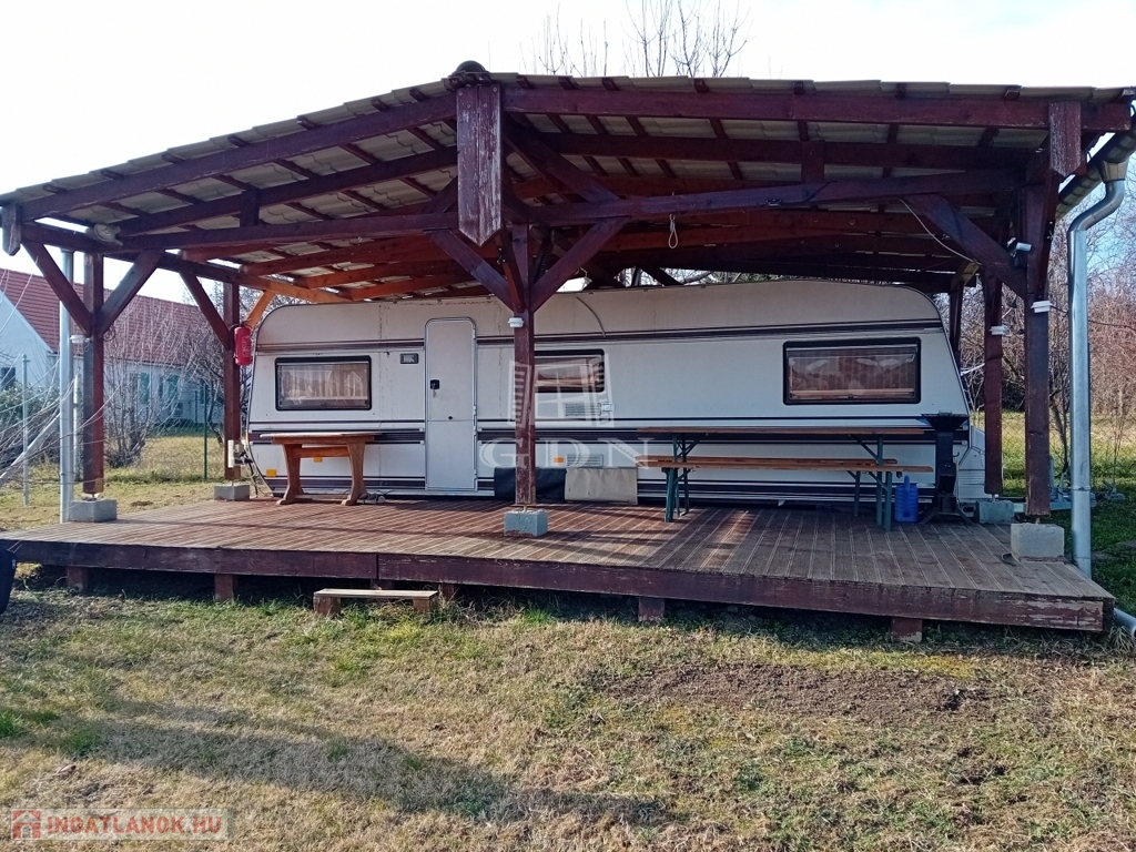 - 50 m²-es fatetőszerkezet, lemeztetővel, alatta 20 m²-es lakókocsi (5 férőhelyes) hangulatos fabútorokkal, kis konyhával