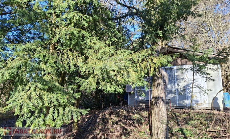 A telek zöld, a növényzet természetes, valamint van rajta egy barátságos kis ház, tárolóval.